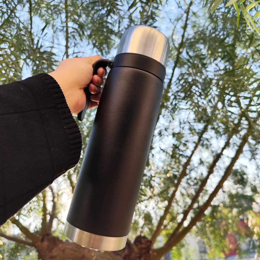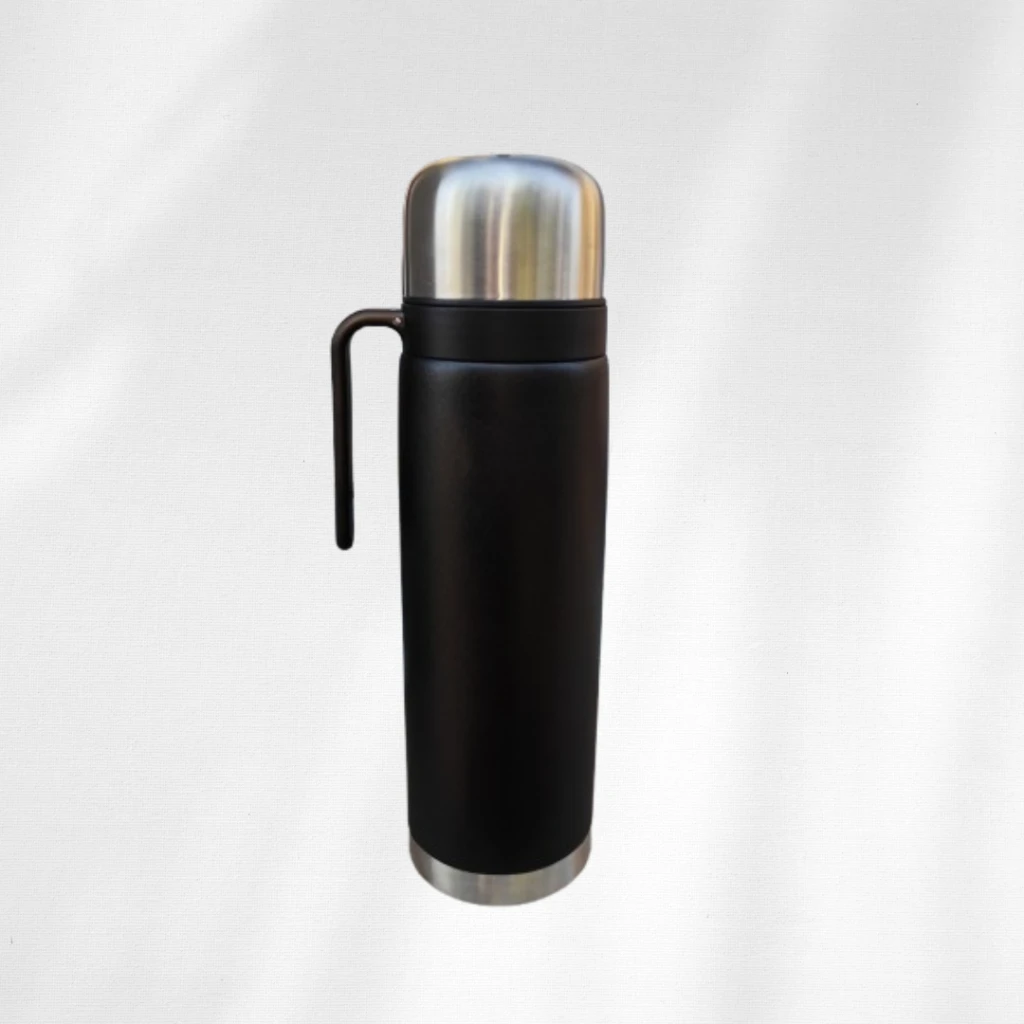 Termo de acero inoxidable media manija color negro, con doble capa de acero, con capacidad de 1 litro y pico cebador.